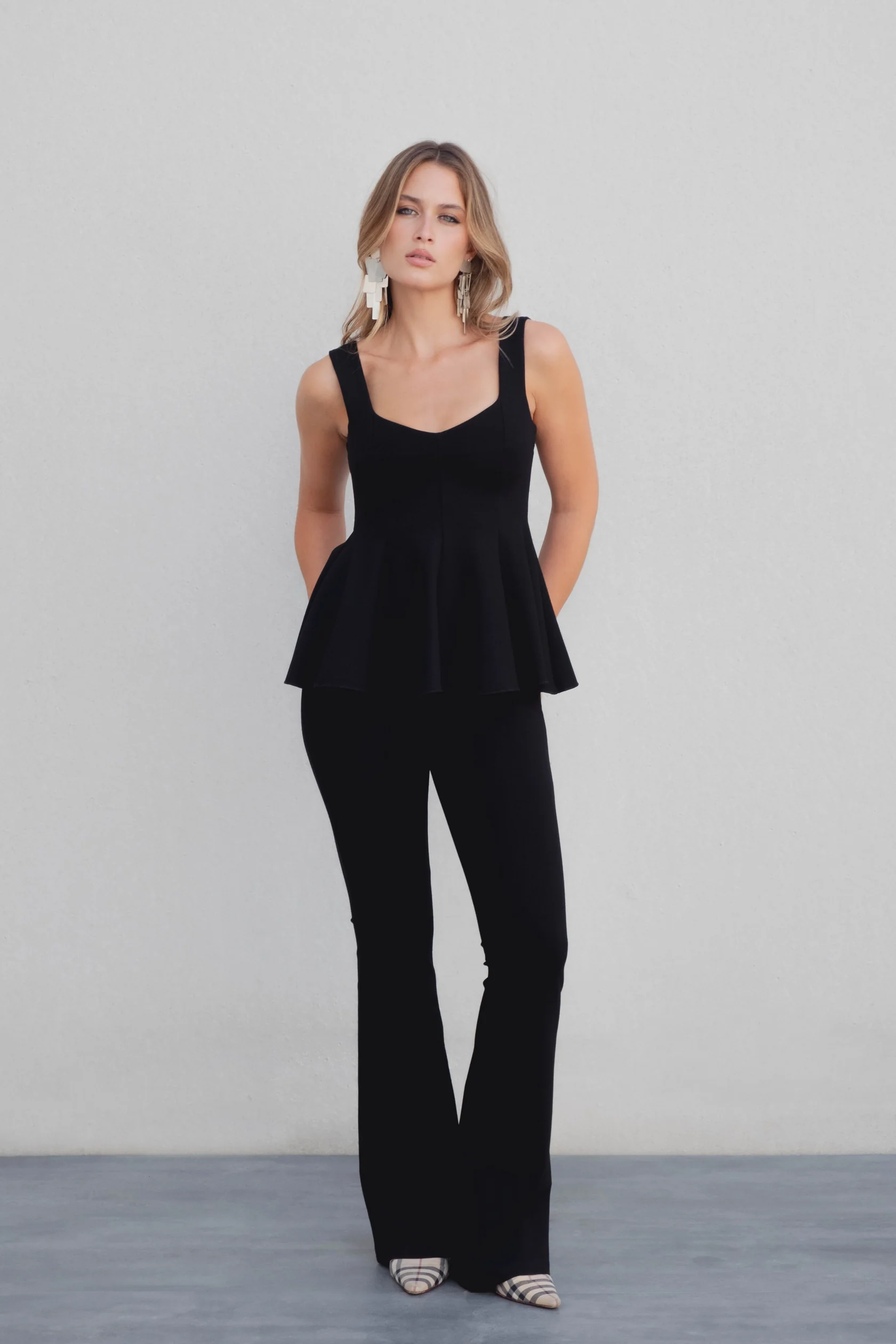 Pantalon flare Emarola. Diseño ajustado y con elástico. Goma en la cintura y acaba en campana.